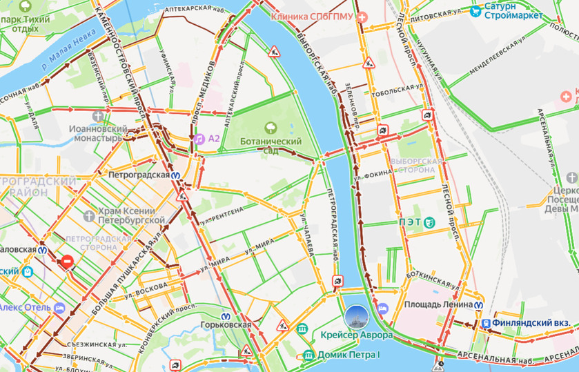 Сложная дорожная ситуация образовалась и в других частях города. Особенно сильно затруднилось движение по Каменноостровскому проспекту, Пироговской набережной, части Большого проспекта П.С., Невскому проспекту в сторону площади Восстания, проспекту Энгельса и Большому Сампсониевскому проспекту.