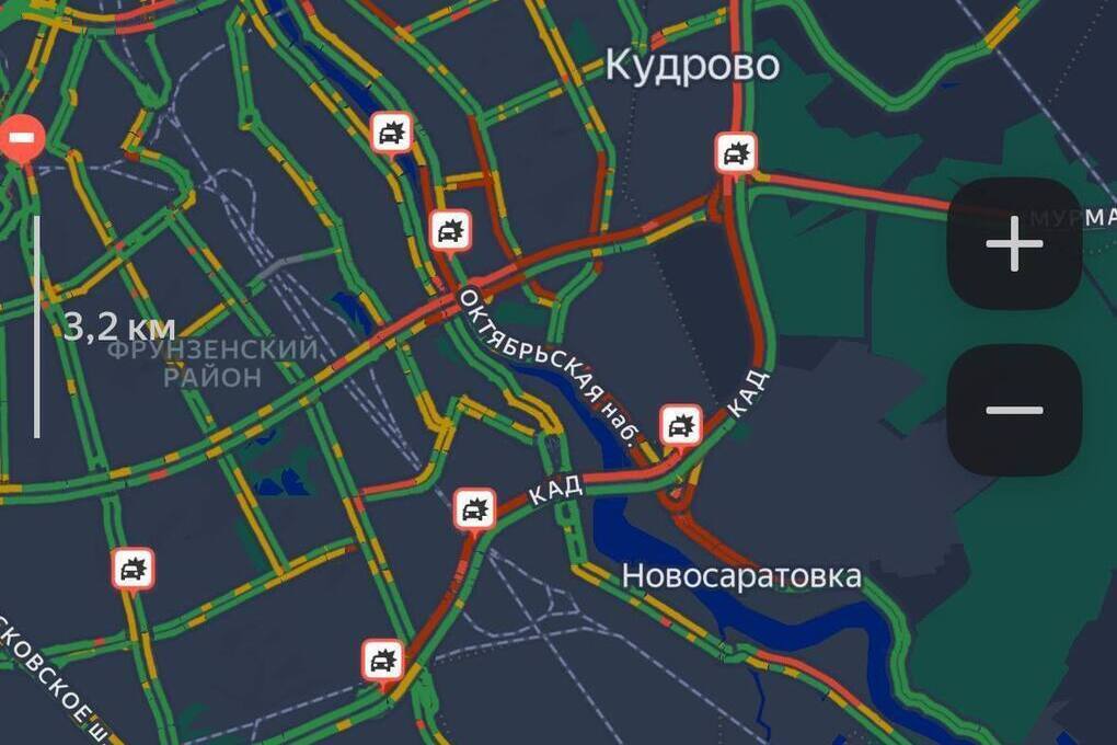 Согласно данным сервиса «Яндекс.Пробки», к 10 часам утра на КАД образовалась 15-километровая пробка в районе вантового моста. Причиной стали несколько аварий. Только на КАД их минимум 6 к 10:36 утра.