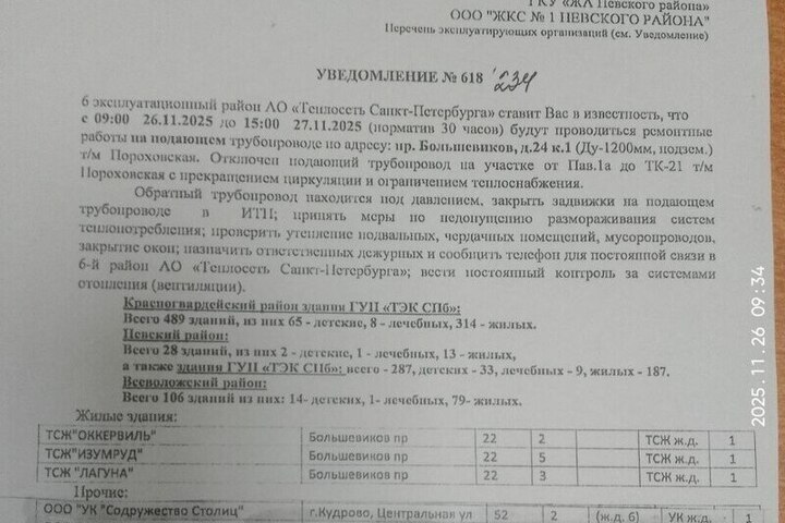 На домах в Кудрово сегодня появилось объявление о том, что теплоснабжение восстановят к 15:00. При этом «АО Теплосеть» на тот момент сообщила, что раньше 19:00 ждать не стоит.