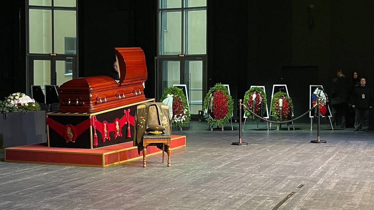 Возле его гроба становится все больше венков, а за ним расположен транспарант с фотографией основателя агентства. Отметим, что также гости церемонии могут увидеть китель с наградами Андрея Константинова, наброшенный на стул. Организаторы специально не стали вешать шторы на окна, чтобы не создавать траур.