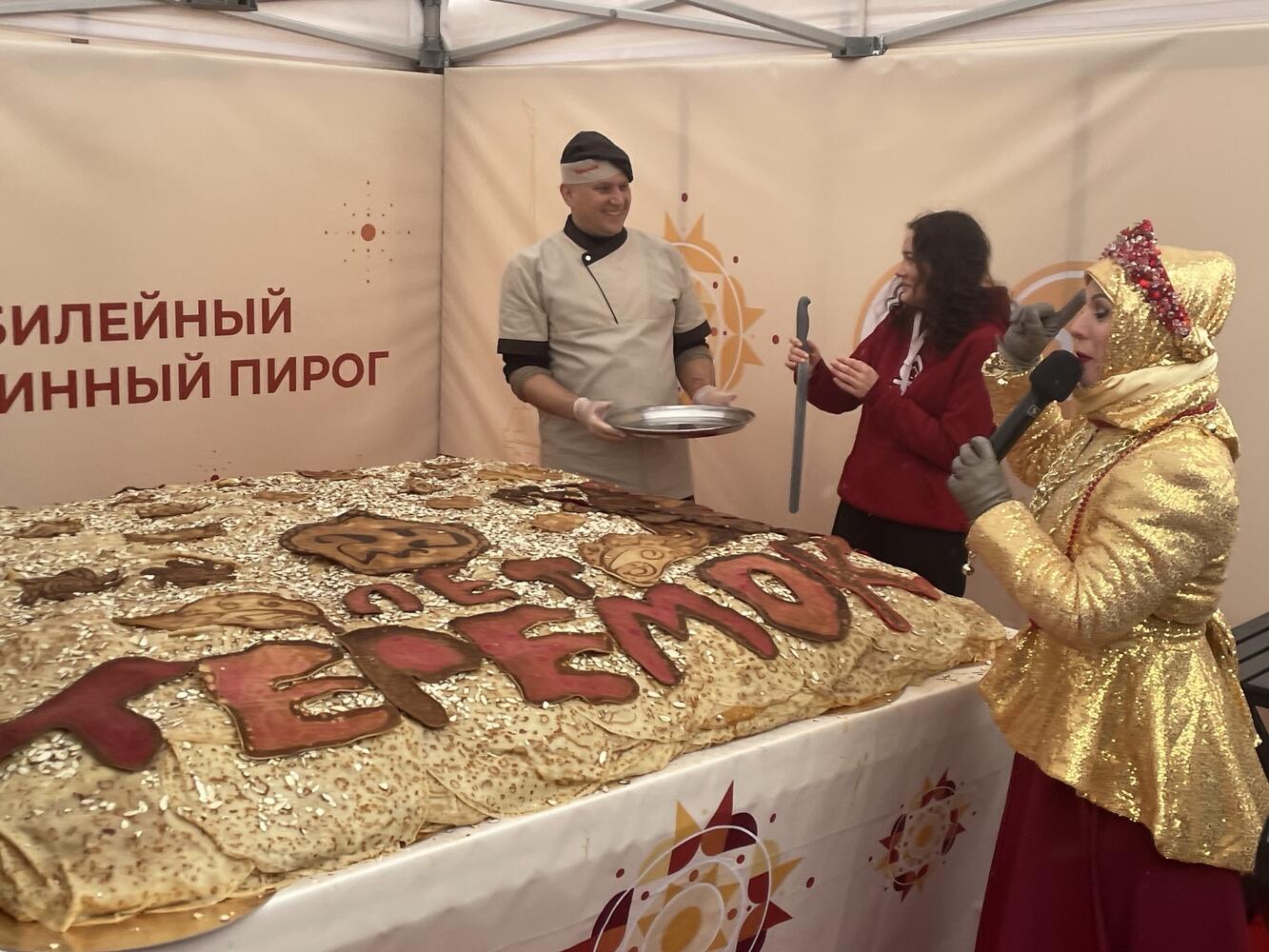 Главным событием последнего дня Масленицы было представление блинного пирога весом в 500 кг. Повара пекли его с раннего утра. Перед блюдом выстроилась огромная очередь.