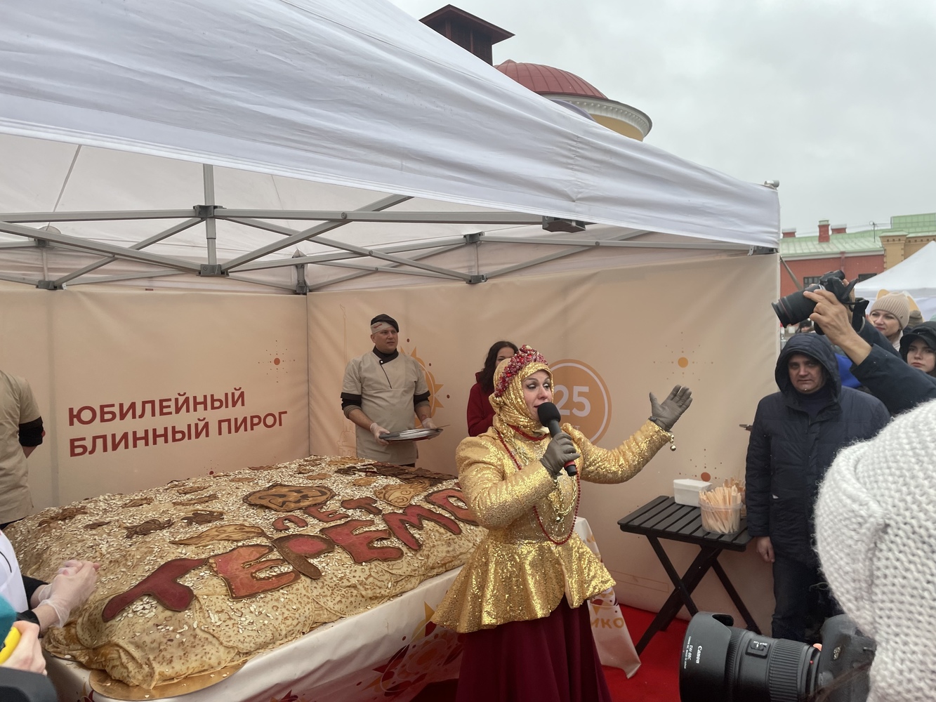 Главным событием последнего дня Масленицы было представление блинного пирога весом в 500 кг. Повара пекли его с раннего утра. Перед блюдом выстроилась огромная очередь.