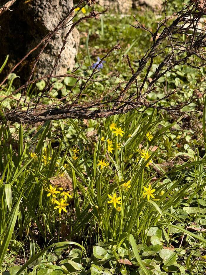 Рядом с ними соседствуют их фиолетовые собратья. Чуть дальше иридодиктиумы сетчатые бледно-лиловых оттенков. За алые и желтые цвета отвечают тюльпаны и луковичные крокусы. Скромно из-под травы выглядывает краснокнижный гусиный лук, пушкиния пролесковидная и ароматные подснежники.