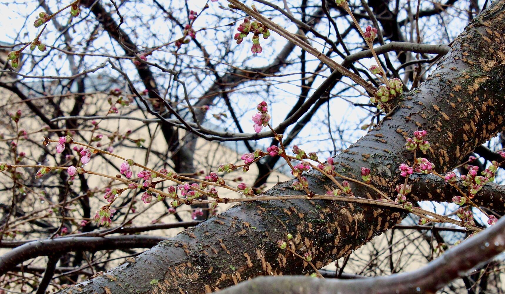 Совсем скоро деревья превратятся в розовые облака, а пока они будто утыканы маленькими розовыми звездочками. Кстати, больше всего бутонов, готовых к раскрытию, на верхних ветках. Видимо, потому что они ближе к солнцу. На прошлой неделе стояла очень теплая погода, которая и побудила растение к росту. Правда, уже сегодня дереву пришлось встретится с мокрым снегом, принесший в город циклон.