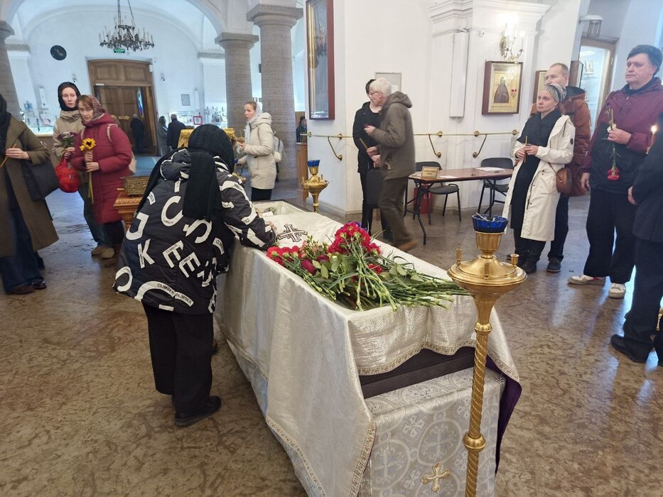 По словам нашего корреспондента, сегодня у собора было немноголюдно. После того, как в храм занесли гроб с телом актера, его открыли и до отпевания присутствующие стали возлагать цветы. Разноцветные астры легли у ног артиста, а вскоре поднялись до его груди, а храм постепенно заполнился.