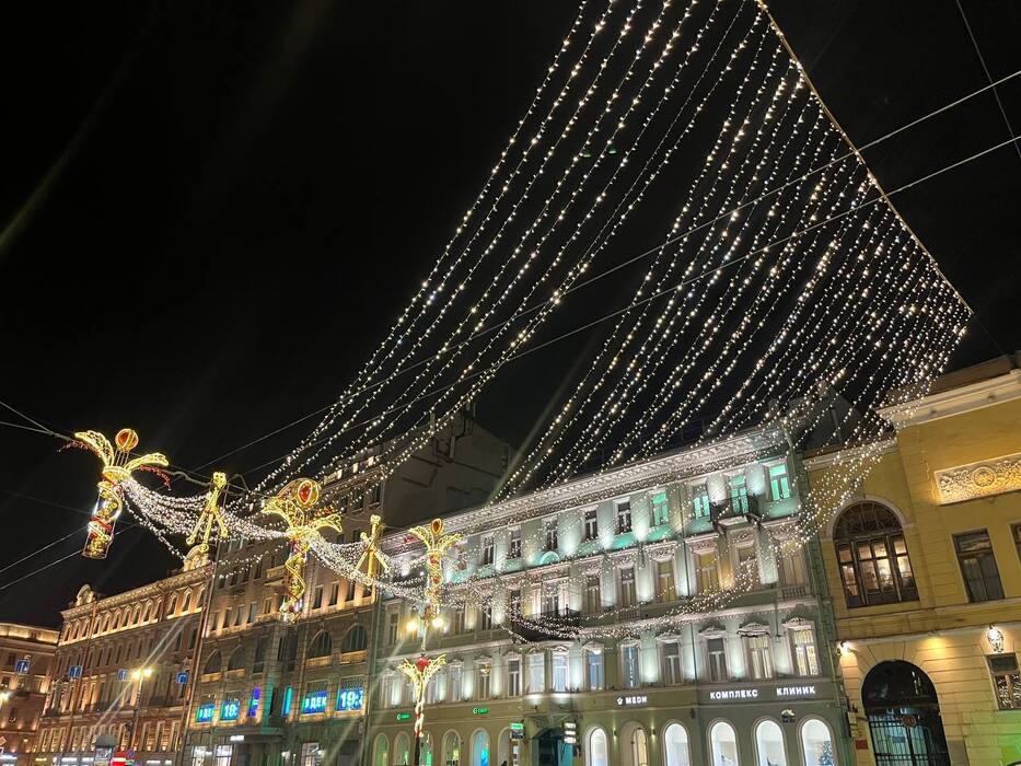У Гостиного двора атмосфера поистине новогодняя, там установили большого Деда Мороза и ёлку, но вдоль дороги подсветки почему-то нет, что портит общее впечатление и создаёт чувство странной пустоты. На Большой Конюшенной несколько световых колец также не работают, отчего теряется радость от увиденного и возникают вопросы к качеству проведённых работ.