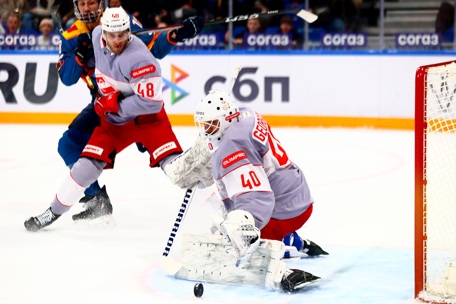 Московские гости активно начали матч, но пропустили первыми на 7-й минуте: защитник неудачно подставил клюшку под высоко летящую шайбу, забив гол. Счет стал 1:0, и тогда «Спартак» перешел в атаку. На 10-й минуте счет сравняли, а на 16-й «Спартак» вышел вперед. Хоккеист Лабанк мог сравнять, оказавшись один на один с Георгиевым, но попал в штангу.
