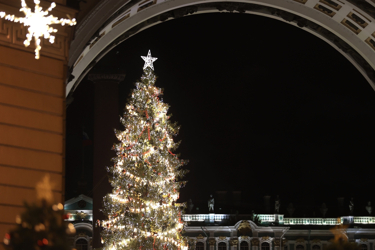 Главную ёлку Петербурга рабочие «укутали» еще с 13 декабря, а 20 декабря на Дворцовой сотни петербуржцев пришли полюбоваться на открытие. Зимняя красавица зажглась тысячью огнями и удивила необыкновенным праздничным сиянием всех присутствующих.