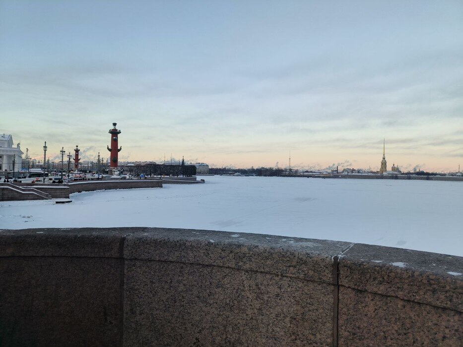 Холода туристов совсем не пугают, а с моста открывается чудесный вид на главные достопримечательности города: Зимний дворец, Петропавловскую крепость и Ростральные колонны.