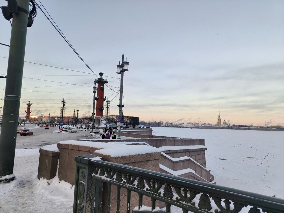 Холода туристов совсем не пугают, а с моста открывается чудесный вид на главные достопримечательности города: Зимний дворец, Петропавловскую крепость и Ростральные колонны.
