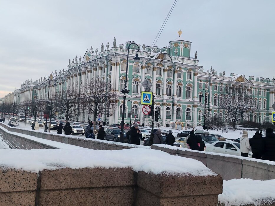 Холода туристов совсем не пугают, а с моста открывается чудесный вид на главные достопримечательности города: Зимний дворец, Петропавловскую крепость и Ростральные колонны.