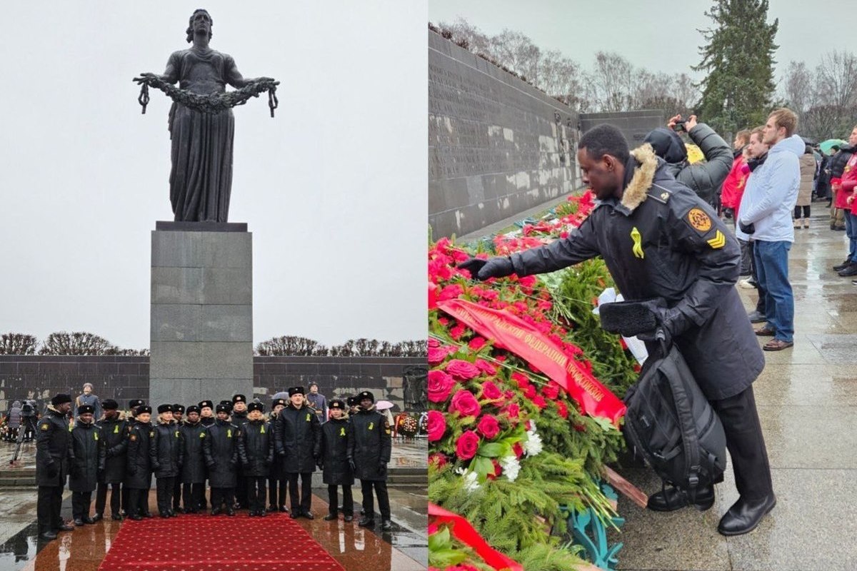 Военнослужащие из Камеруна, Бурунди, Таиланда, Камбоджи, Гвинеи, Экваториальной Гвинеи, Вьетнама и Намибии возложили цветы к монументу «Мать-Родина» на Пискаревском мемориальном кладбище.