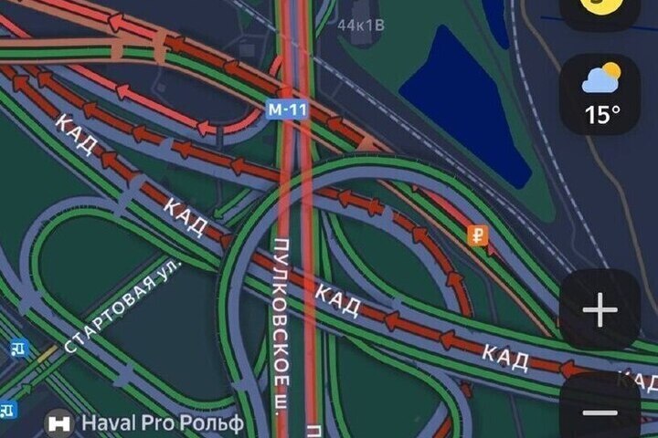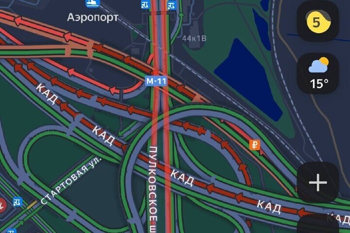 Приложение «Яндекс.Пробки» показывает длинную масштабную пробку на развязке Пулкоского шоссе и ЗСД.