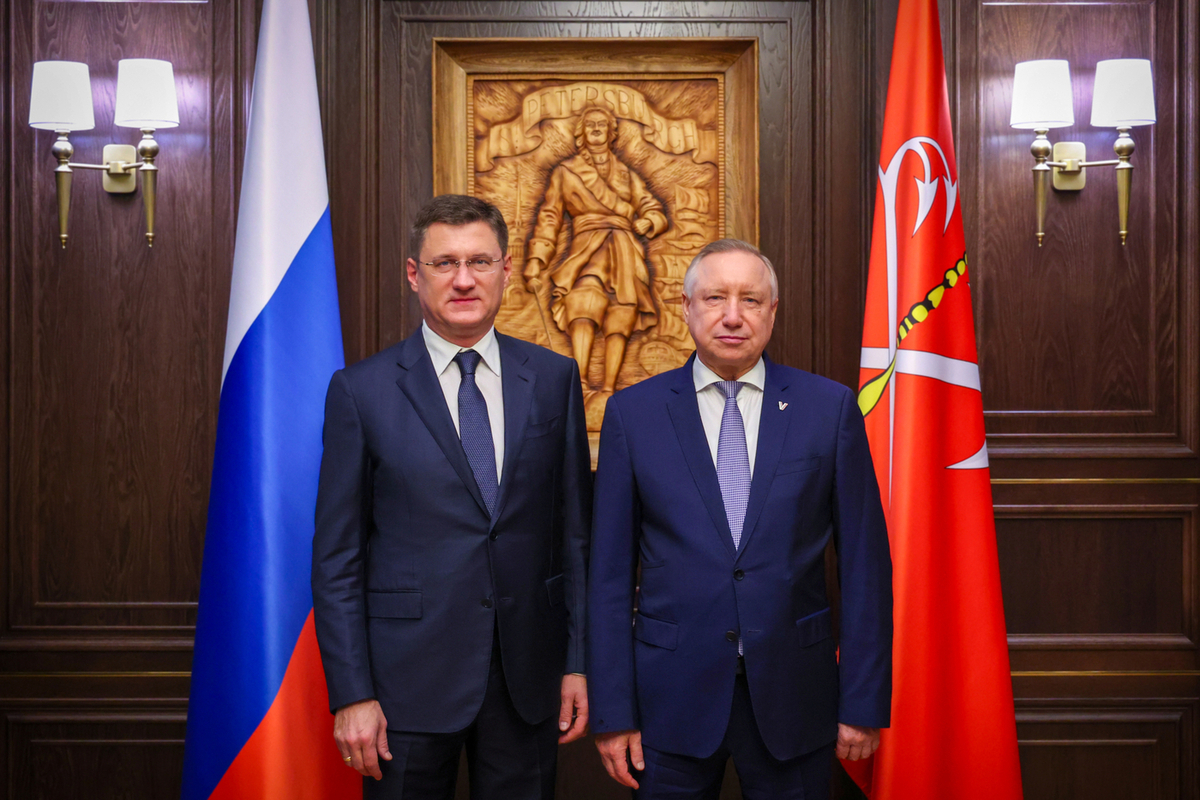 В Смольном губернатор Александр Беглов встретился с заместителем председателя Правительства Российской Федерации Александром Новаком для обсуждения рабочих вопросов. На встрече рассматривались вопросы обеспечения города энергией, улучшения надёжности электроснабжения, обновления теплосетей, развития газоснабжения Петербурга и другие аспекты.
