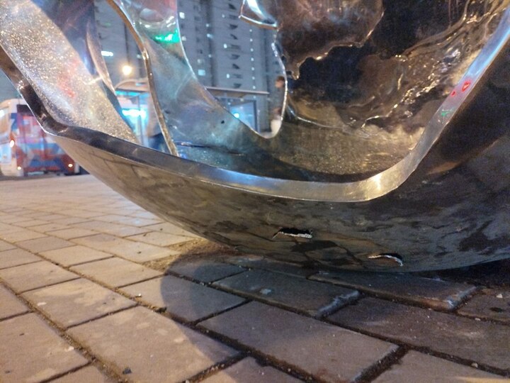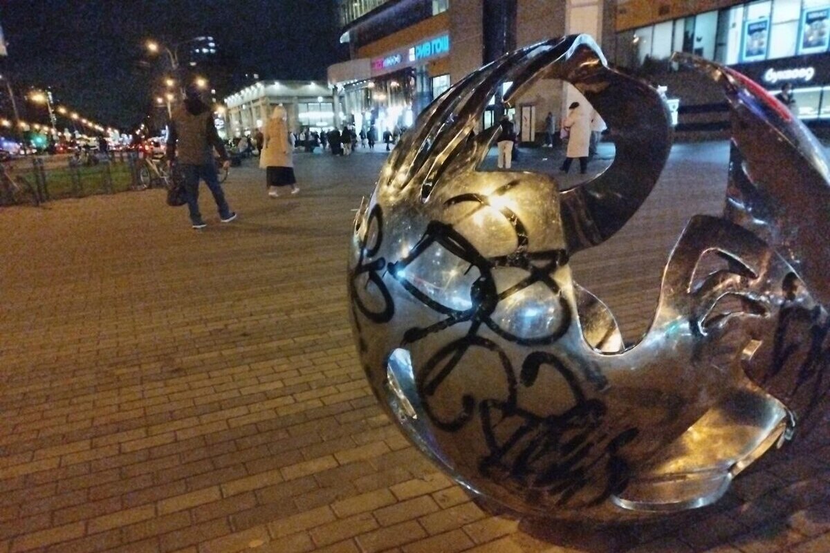 «На всех поверхностях нанесены надписи чёрным маркером. Некоторые детали во время катания по площади у ТРК «Норд» погнулись. Шар вернули на место, но не похоже, что закрепили. Самые жуткие повреждения внизу — там металл просто искорежен», — уточняет журналист.