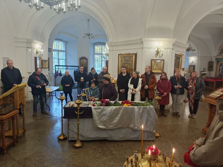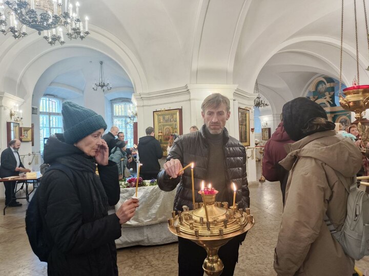 Отпевание артиста началось в 12:00. По словам нашего журналиста Натальи Ефимовой, сначала у собора было немноголюдно. Несколько мужчин занесли гроб с телом Дениса Семенова в храм и открыли для прощания. Разноцветные астры вскоре покрыли всё тело почившего актера.
