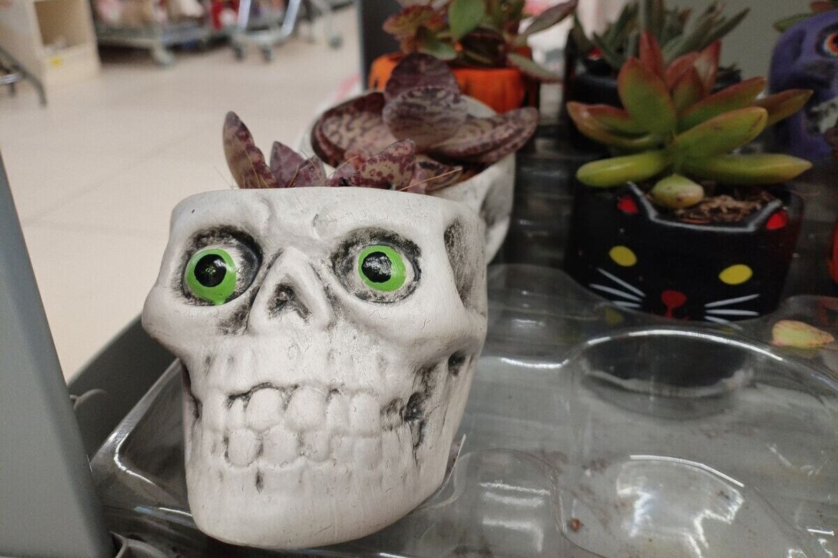 Следующая точка отметилась только хэллоуинскими кашпо в виде черепа, тыквы, черного кота.