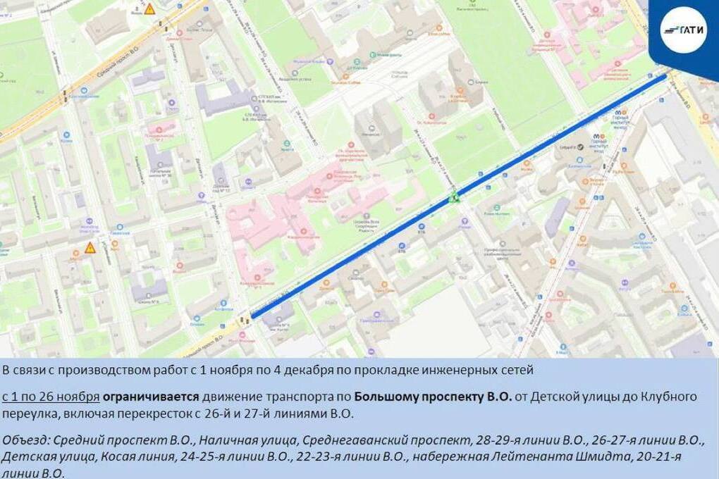 С 1 по 26 ноября ограничат движение по Большому проспекту Васильевского острова на участке от Детской улицы до Клубного переулка, включая перекрёсток с 26-й и 27-й линиями. Работы по прокладке инженерных сетей продлятся до 4 декабря. Для объезда этого участка рекомендуется использовать: Средний проспект В.О., Наличную улицу, Среднегаванский проспект, 28-29-ю линии В.О., 26-27-ю линии В.О., Детскую улицу, Косую линию, 24-25-ю линии В.О., 22-23-ю линии В.О., набережную Лейтенанта Шмидта и 20-21-ю линии В.О.