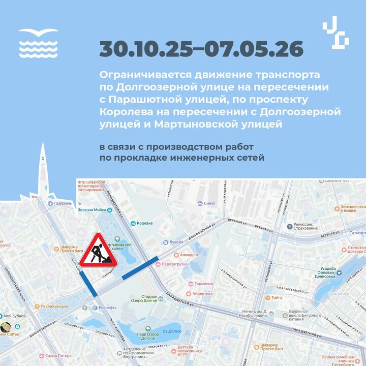 С 30 октября 2025 года по 7 мая 2026 года в рамках прокладки инженерных коммуникаций вводятся временные ограничения движения автотранспорта. Об этом сообщили в пресс-службе администрации Приморского района. Ограничения затронут несколько участков дорог: