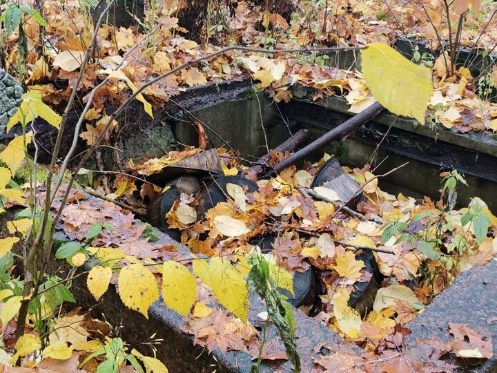 Местами попадаются могилы с проломленной оградой и даже с проломленным основанием, куда падают листья или даже сбрасывают мусор.