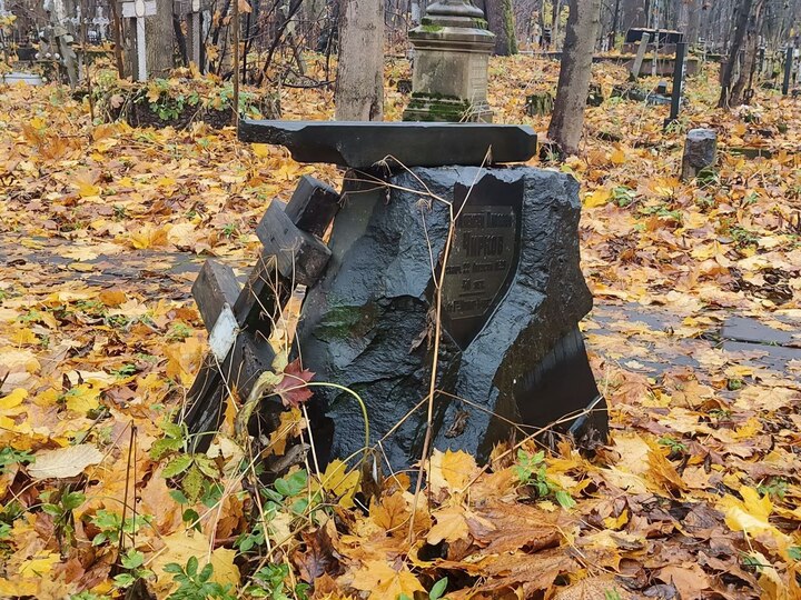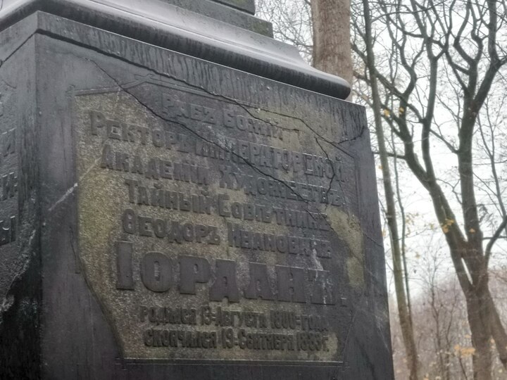 Так выглядит надгробие ректора Императорской академии художеств Федора Иордана. Захоронение XIX века, обломана часть креста, и общий вид оставляет желать лучшего, часть с именем расколота.