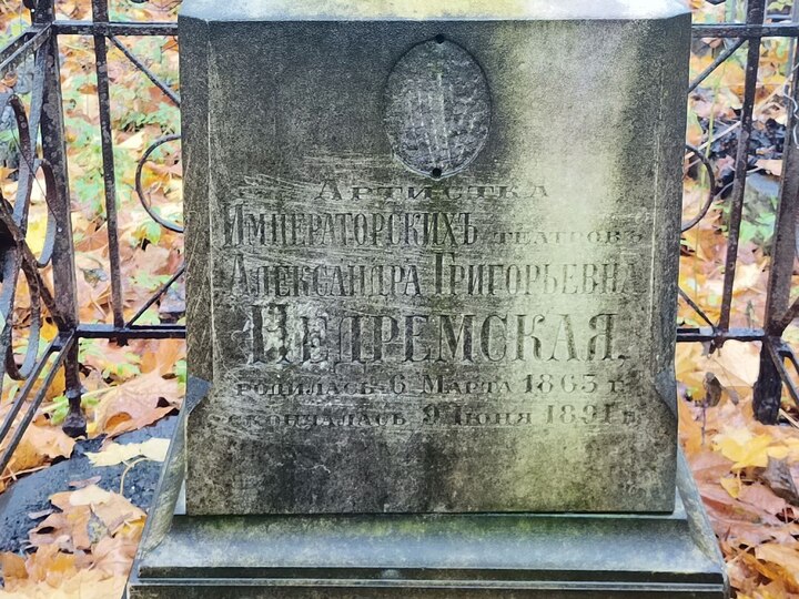 Кто-то не слишком бережно, но стер с надгробного камня XIX борозды, и теперь можно распознать, кто здесь похоронен. Актриса императорского театра Александра Григорьевна Недремская скончалась в возрасте 28 лет, по официальной версии, от разрыва сердца. А.А. Плещеев в своей книге «Наш балет», вышедшей в 1897 году, так отзывался о таланте молодой женщины: «Отличительными качествами исполнения хорошенькой г-жи Недремской были грациозность и лёгкость; танцуя с огоньком, с задором, она умела выдвигать совершенно пустенькие pas, которые благодаря ей делались заметными».
