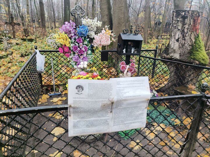 Могила писательницы Лидии Чарской, автора знаменитой повести «Записки институтки», хоть и полна искусственных цветов, а за оградой кто-то даже бережно собирает листья, но вот именная табличка в виде скомканного листа на цепи выглядит очень неопрятно.
