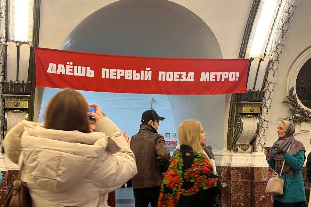 Петербуржцы, оказавшиеся 15 ноября на станции метро «Площадь Восстания», удивлялись необычному убранству станции — в честь дня рождения метро здесь закрепили баннеры в советском стиле. На растяжках пассажиры читали: «Ленинграду — образцовый метрополитен», «Спасибо от ленинградцев за прекрасный подарок!», «Даешь первый поезд метро», «Ленинградский метрополитен вступил в строй». Многие горожане и гости Петербурга с удовольствием фотографировались на фоне баннеров. Но гораздо больше пассажиров заинтересовал прибывший в полдень на станцию «Площадь Восстания» ретропоезд 1950‑х годов. Четырехвагонный состав, аналогичный первым поездам ленинградской подземки, встретили аплодисментами. В это время в Петропавловской крепости грянул полуденный залп, посвященный дню рождения метрополитена. Чуть позже на станции прошло модное дефиле в ретронарядах.