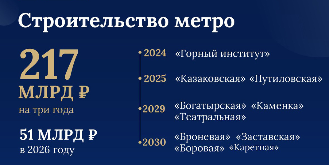 О том, что развитие метро — один из приоритетов для города, свидетельствует проект бюджета на 2026-й и последующие годы. На прокладку тоннелей и строительство станций заложено 217 млрд рублей. Из них 51 млрд планируют израсходовать уже в 2026 году. Среди планов на ближайшее будущее — до конца 2025 года завершить первый пусковой участок новой, шестой линии со станциями «Казаковская» и «Путиловская».