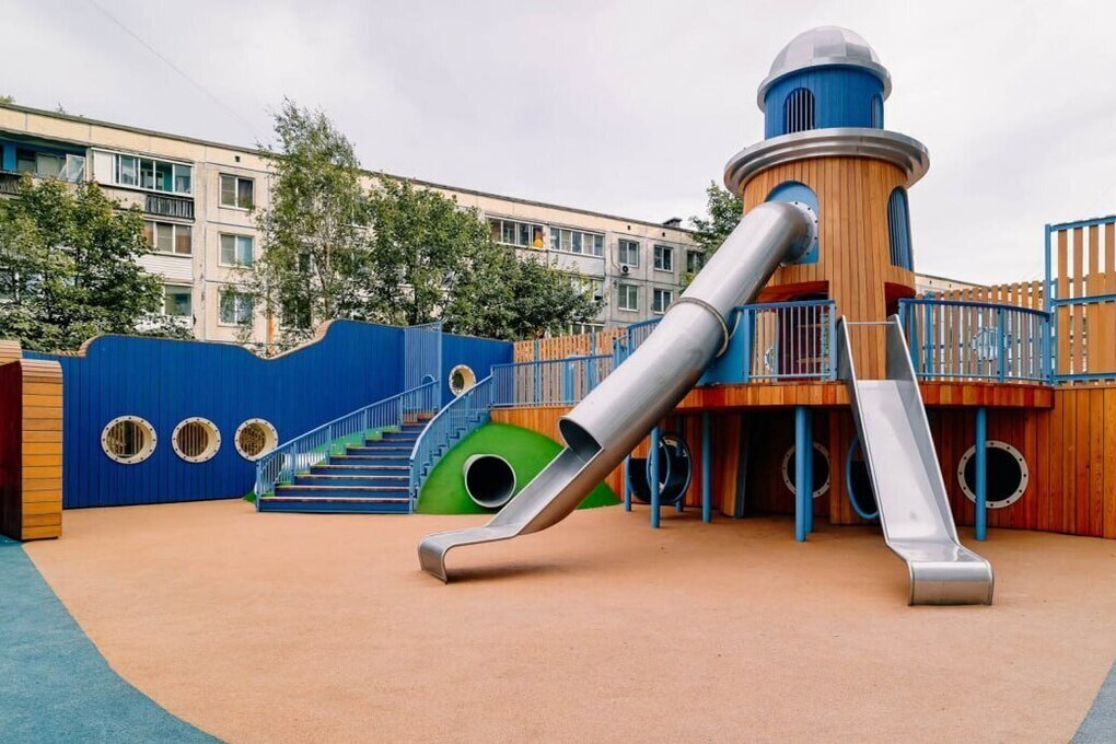 В жилом комплексе «Лайнеръ» в Невском районе Петербурга установили детскую площадку. Ее выполнили в морской стилистике и оборудовали горкой в виде маяка. Во дворе расположены игровые зоны для детей различных возрастов: песочницы, горки и лазалки. Также там разместили спортивную площадку с тренажерами, а для отдыха установили качели.