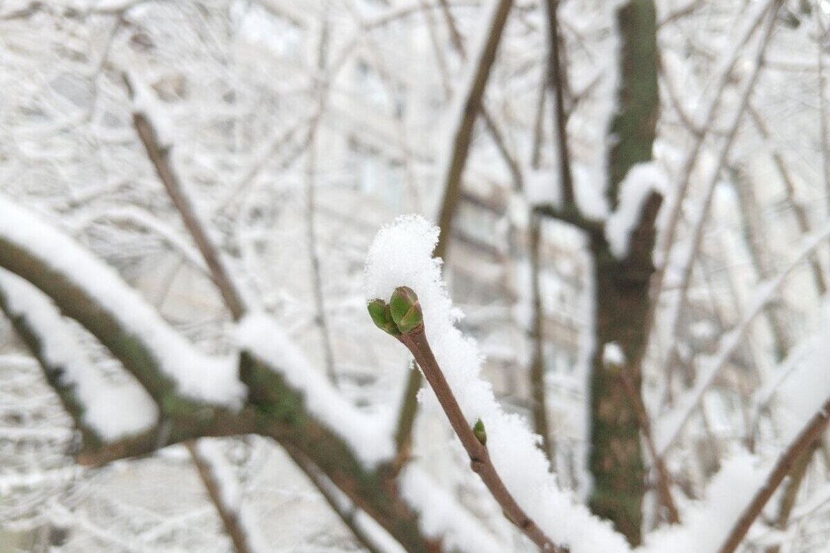 Набухшие из-за теплой осени почки на деревьях Петербурга припорошило снегом. Фото: МК в Питере / Наталья Морозова