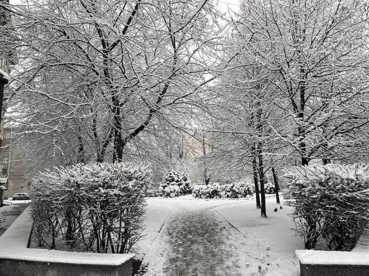 Набухшие из-за теплой осени почки на деревьях Петербурга припорошило снегом. Корреспондент «МК в Питере» Наталья Морозова отметила, что в городе под снегопадом оказалось немало еще зеленых деревьев.