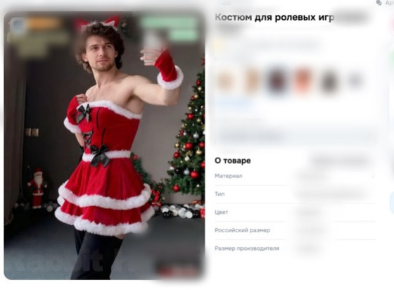 В нескольких карточках товаров красуются мужчины в женской одежде. На фотографиях можно увидеть молодого человека в чокере, чулках и с ободком на голове, позирующего перед зеркалом. Другая модель, с более выраженной мускулатурой, демонстрирует новогоднее мини-платье с рюшками, бантиками, митенками и чулками.