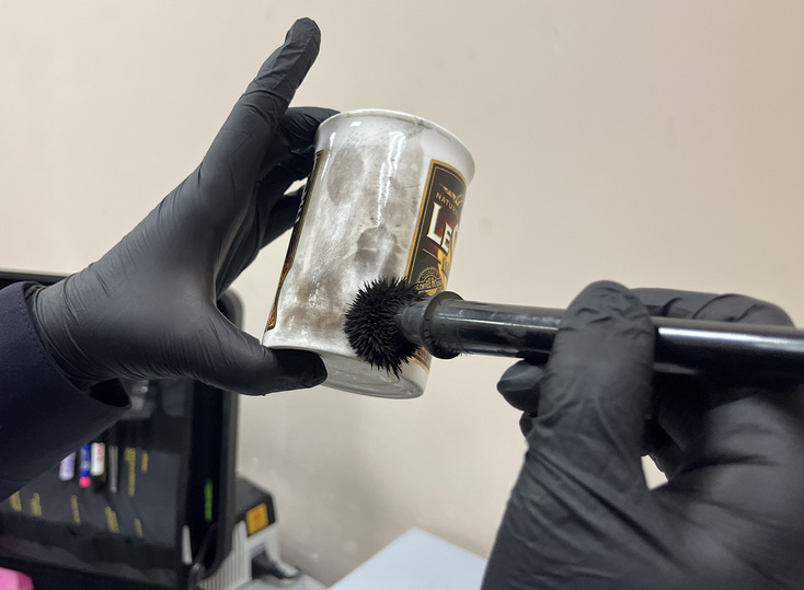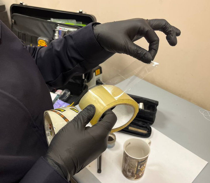 Показывая, что следы можно найти где угодно, эксперт берет свою кружку и легкими движениями магнитной кисти наносит дактилоскопический порошок. На глазури сразу проступают отпечатки. Нужные фрагменты криминалист переносит на скотч, подписывает, где и когда производилось «изъятие», и убирает в чудо-чемоданчик.