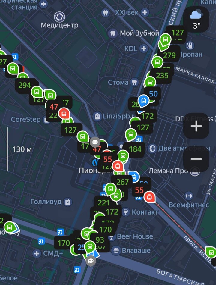 В приложении «Яндекс.карты» от количества транспорта не разобрать номера троллейбусов и автобусов. На Богатырском проспекте произошла авария. Но и это ещё не всё.