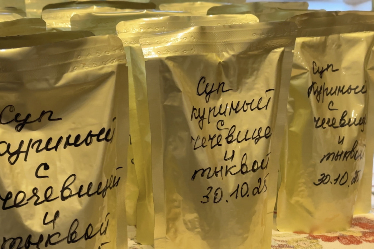 Готовые блюда сделаны особым способом, который позволяет хранить их до двух лет без холодильника, сохраняя вкус и пользу. Их приготовили вместе с женским батальоном имени Розы Шаниной.