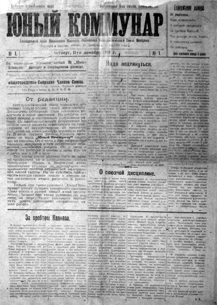 Сегодня исполняется 106 лет со дня публикации первого номера газеты «Юный коммунар» — издания Московского комитета Российского Коммунистического Союза Молодёжи, ставшего отправной точкой в истории будущего «Московского Комсомольца».