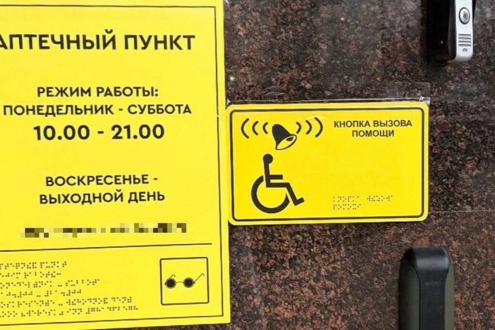 На входе в аптеку отсутствовали вывеска с графиком работы, выполненная рельефно-точечным шрифтом Брайля, и кнопка вызова специалиста, что нарушало права инвалидов на доступность.