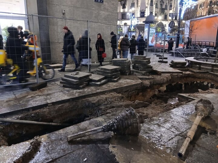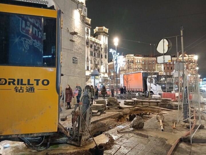 Работы планируют завершить ночью. Сейчас у метро довольно грязно. При буровых работах продолжает подаваться вода, поэтому жидкость из ямы откачивает насос. Однако грязь вместе с водой всё равно попадает на тротуар и разносится дальше.