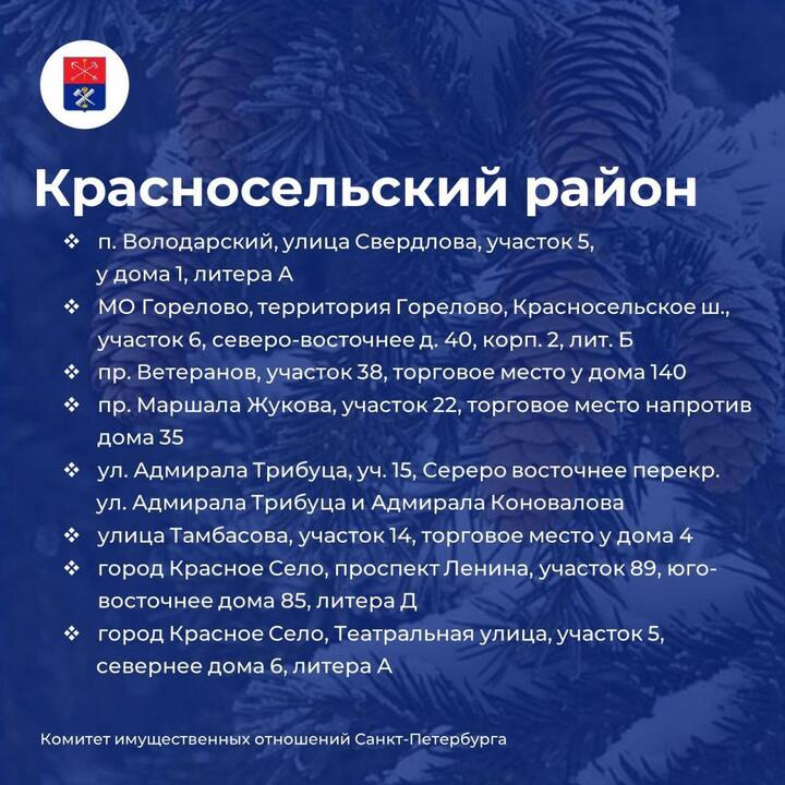 В Кировском и Пушкинском районах заработали по три точки, а в Кронштадтском и Петродворцовом районах — по одной. Больше всего ёлочных базаров открылось во Фрунзенском районе — сразу десять торговых площадок.