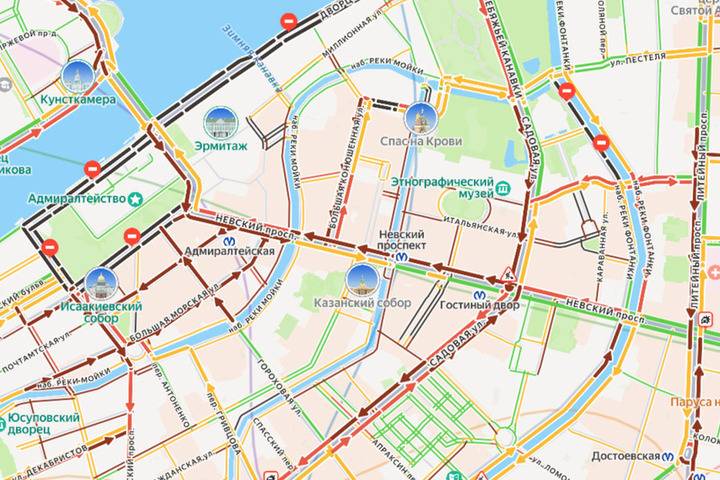 Самый длинный затор в 18:30 наблюдается на Садовой улице – пробка растянулась от Гороховой улицы до набережной реки Мойки. Водители сообщают о перекрытии дорог.