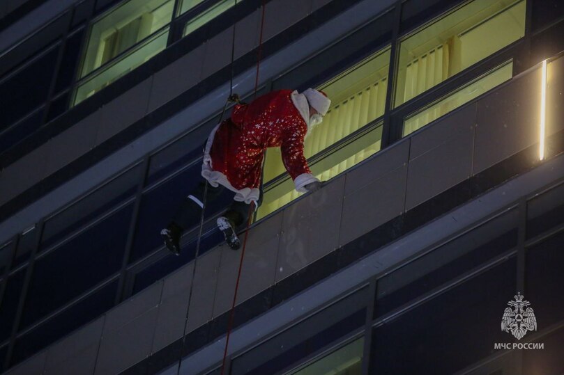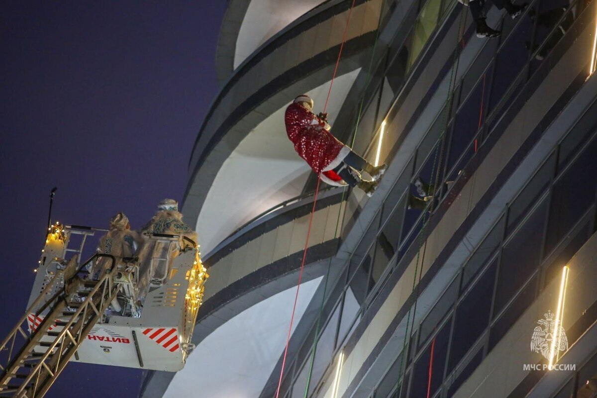 Бойцы Специализированной пожарно-спасательной части имени А.П. Кудряшова МЧС России по Санкт-Петербургу переоделись в костюмы Дедов Морозов и спустились с крыши здания, чтобы поздравить ребят через окна палат. Настоящим сюрпризом стало появление за окнами Деда Мороза и Снегурочки.