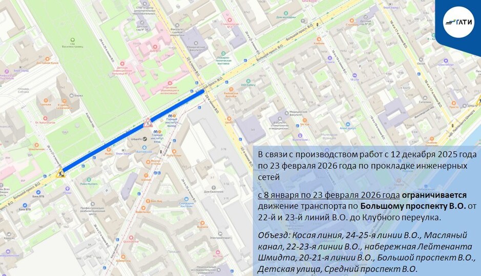 В Василеостровском районе с 12 декабря 2025 года по 23 февраля 2026 года из-за прокладки инженерных сетей с 8 января по 23 февраля 2026 года ограничат движение транспорта по Большому проспекту В.О. от 22-й и 23-й линий В.О. до Клубного переулка.