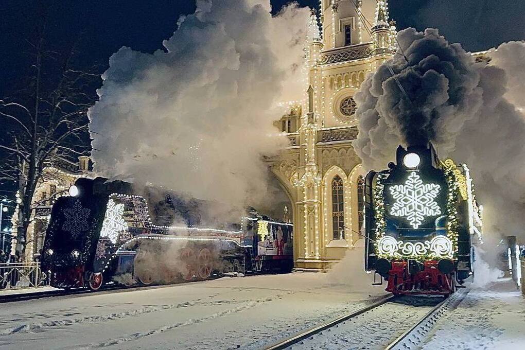 В Новый Петергоф прибыл поезд с Дедом Морозом и Снегурочкой 6 января. Вагоны украшены узорами и гирляндами, внутри — сказочный дворец из Великого Устюга.