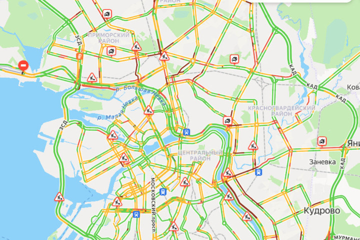 Петербург в первый рабочий день после новогодних каникул сковали пробки. По данным сервиса Яндекс.Карты, загруженность улично-дорожной сети города утром достигла 6 баллов.